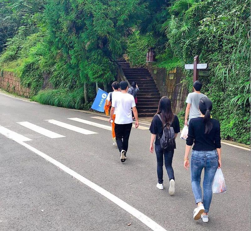 餐后全体成员稍作歇息,开始了本次活动的准备工作。本次团队活动为了激励成员,增加团队凝聚力,特别安排团队竞赛模式,终点站设为银顶峰。竞赛要求每个小组必须全体成员到达终点才算获得胜利,前两名的小组将会获得现金奖励。全体成员分为红队、黄队、蓝队、橙队四个小队,分发了登山食物和水之后,各个队伍高举本队旗帜,朝着天台山山门进发。